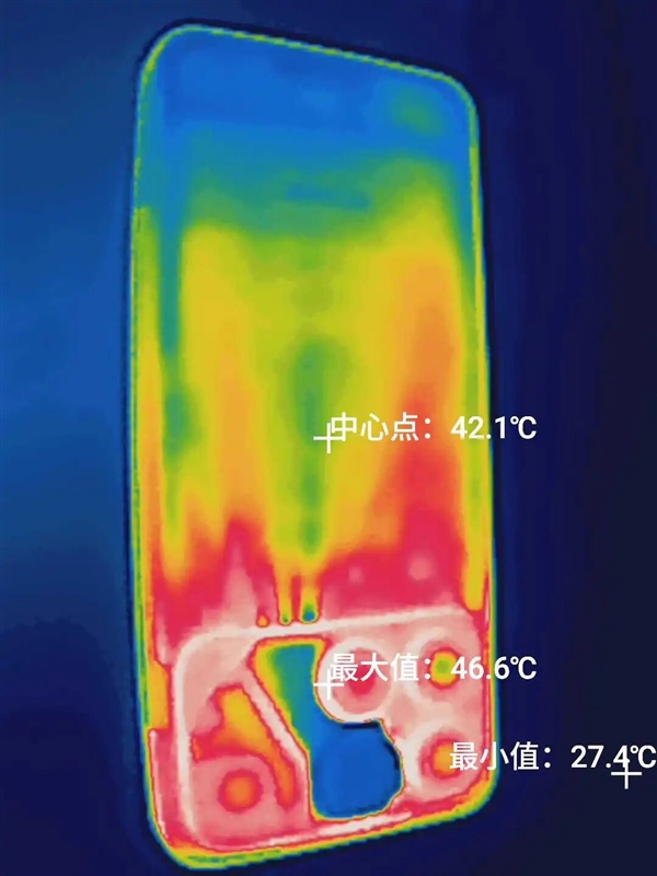 而机身后背最高温度连 40 度都不到,从测温图也能看出来电扇和风道是一蓝色,跟机身其他区域构成明显对比,这电扇有事儿是实上啊。。。